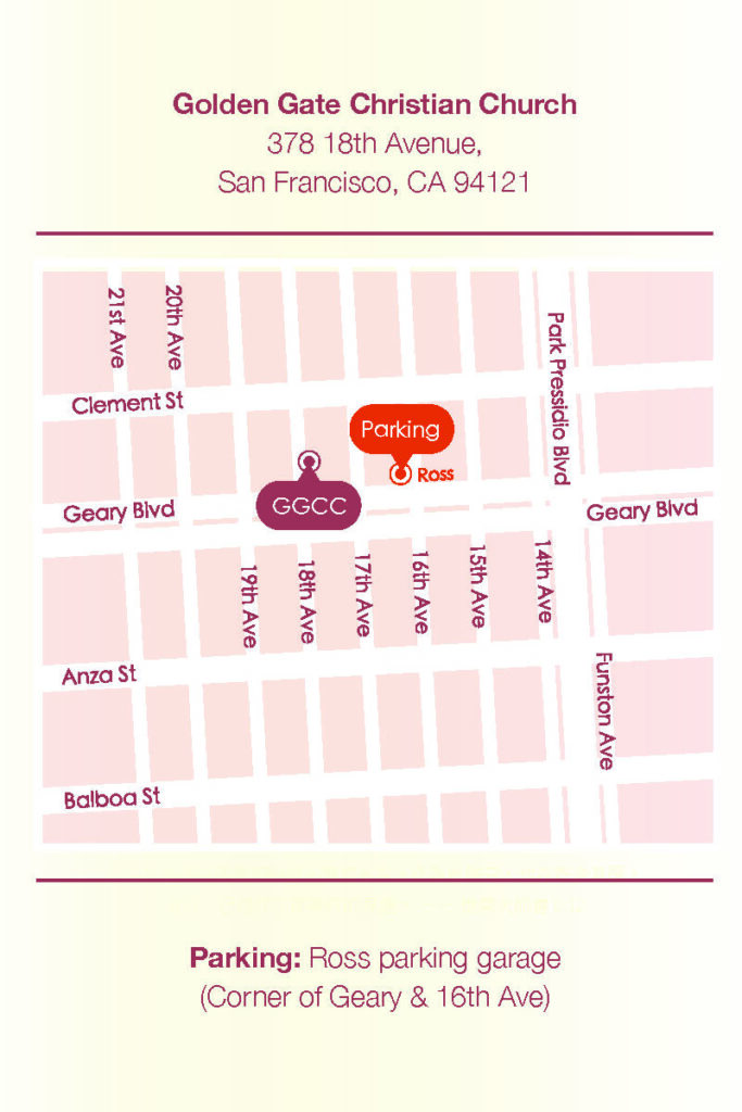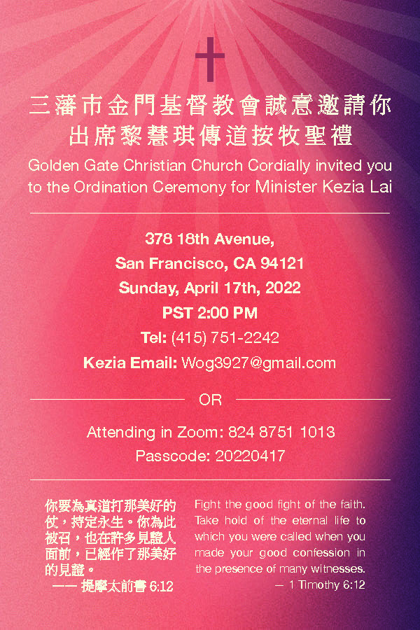 地點: 三藩市金門基督教會 (378 18th Ave, San Francisco, CA 94121)