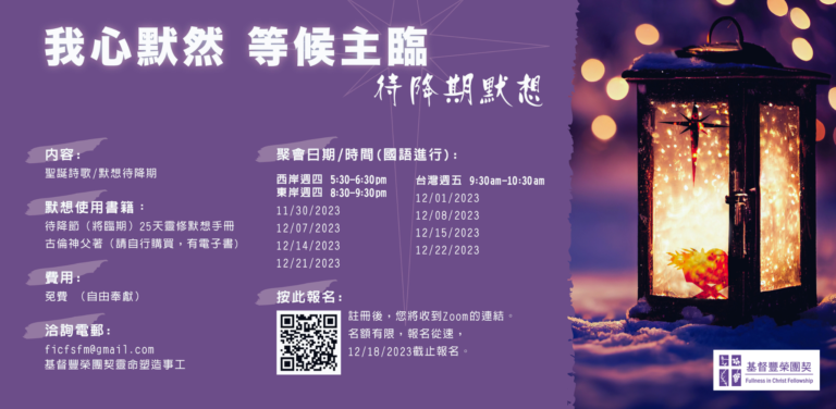 基督豐榮團契靈命塑造團隊將用四週來默想耶穌降生所帶來的奇異恩典。歡迎你與我們一同聆聽神的話,透過默想進入神已為我們預備好的莫大祝福。誠摯邀請您一同迎接和平之君的降臨!