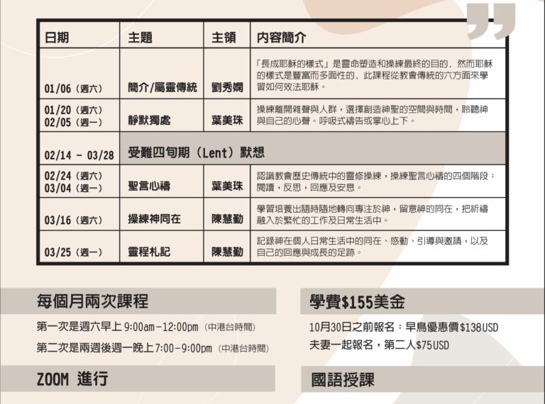 - 學習教會歷史傳統的屬靈操練,將門訓帶到更深的層面,帶來心靈更新及生命轉化。